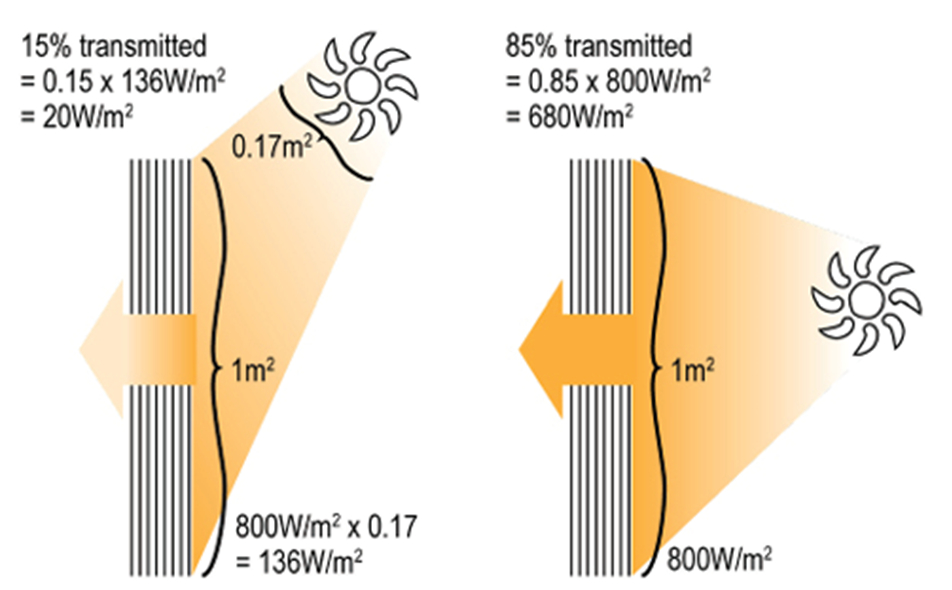 The angle that solar radiation strikes glass has a major impact on the amount of heat transmitted. When the sun is perpendicular to the glass it has an angle of incidence of 0°. For standard clear glass 85% of solar heat is transmitted. As the angle increases, more solar radiation is reflected, and less is transmitted. It falls sharply once the angle exceeds 55°. Also, as the angle increases, the effective area of exposure to solar radiation reduces.